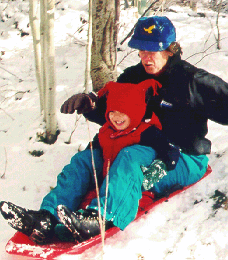 | Cameron Fassett proves he's no fool sledding with dad (Uncle Ben) down their driveway...right into the garage. | With all that home sledding under his belt, Cam and mom (Aunt Carol) take on the big slopes: Big Cottonwood Canyon in Salt Lake City. |